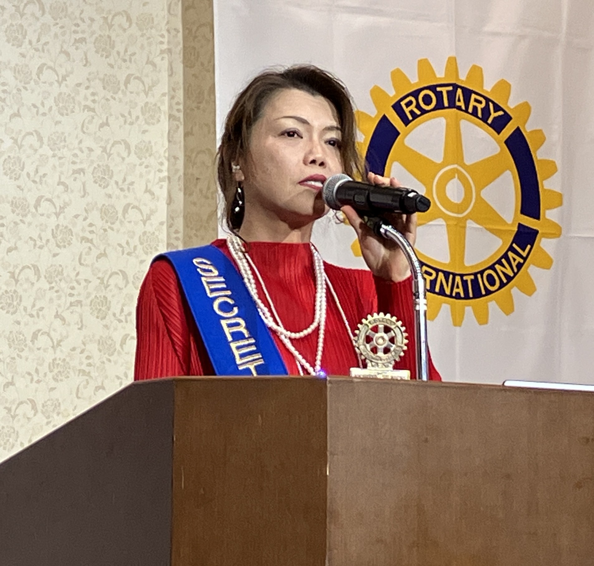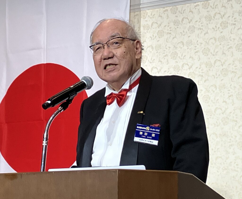 まず、愛知県立名古屋聾学校の皆さまにお越しいただきました。また、本日はロータリアンのご家族、ご友人の皆さまにも多数ご参加いただいております。あわせて御礼申し上げます。さらに、本年度当クラブで受け入れております青少年交換留学生、デンマークから来ているエリウス、そして日頃から彼を支えてくださっているホストファミリーの皆さまにもご出席いただいております。