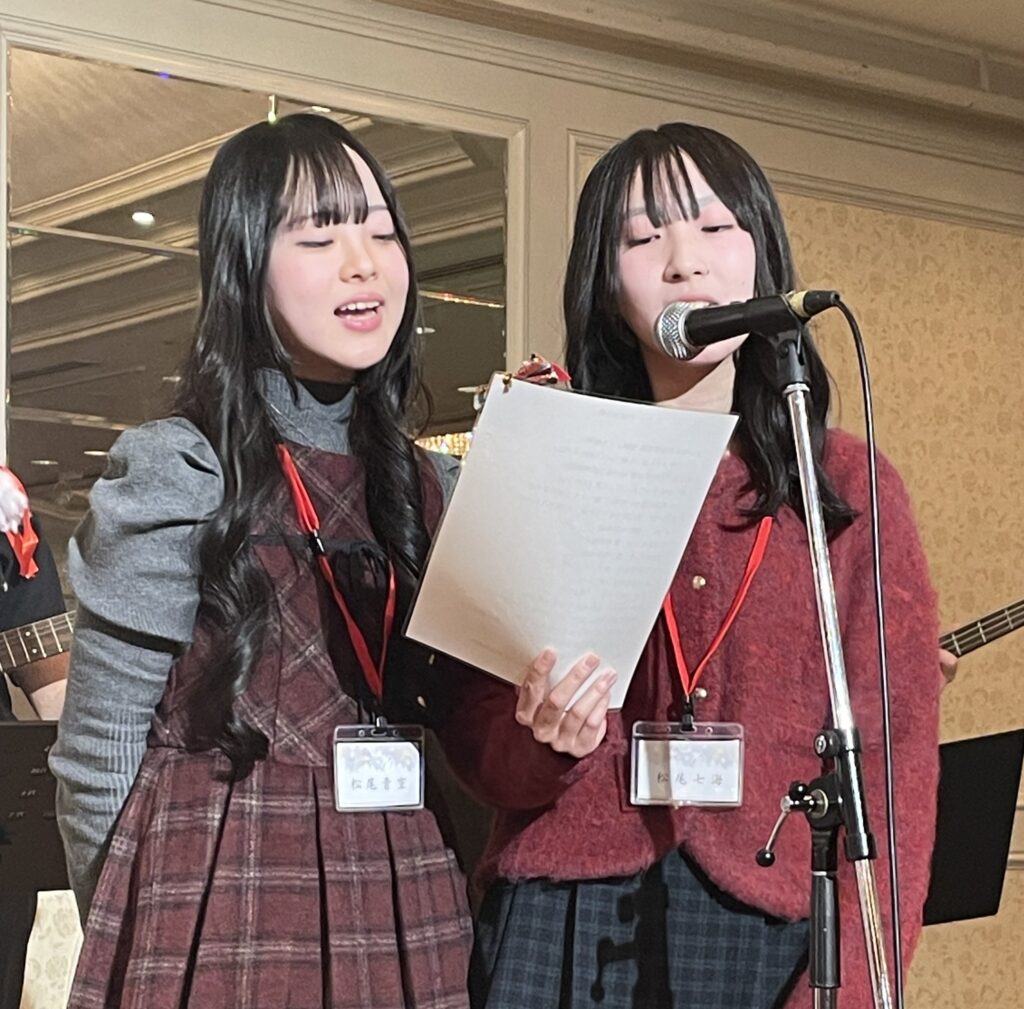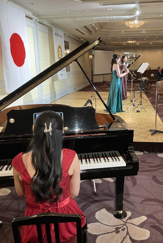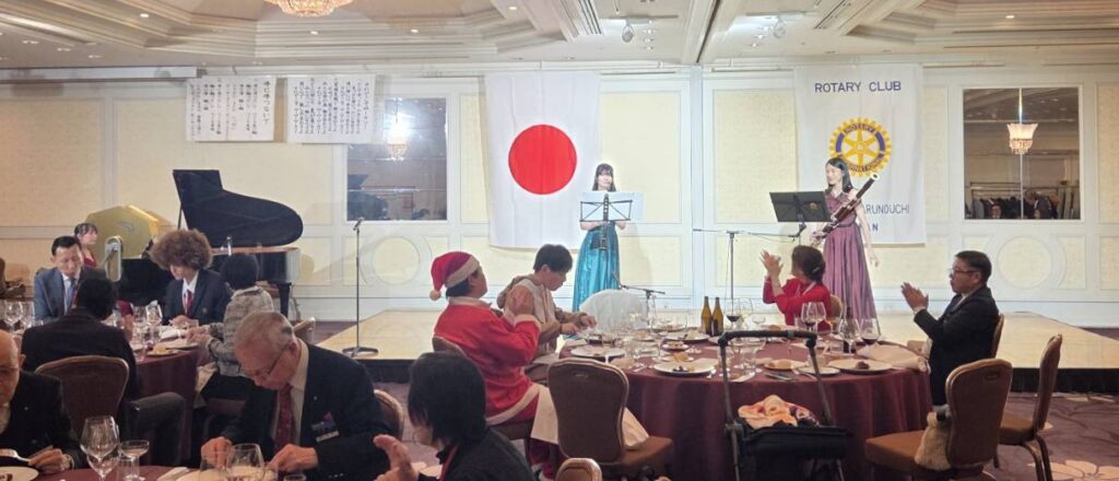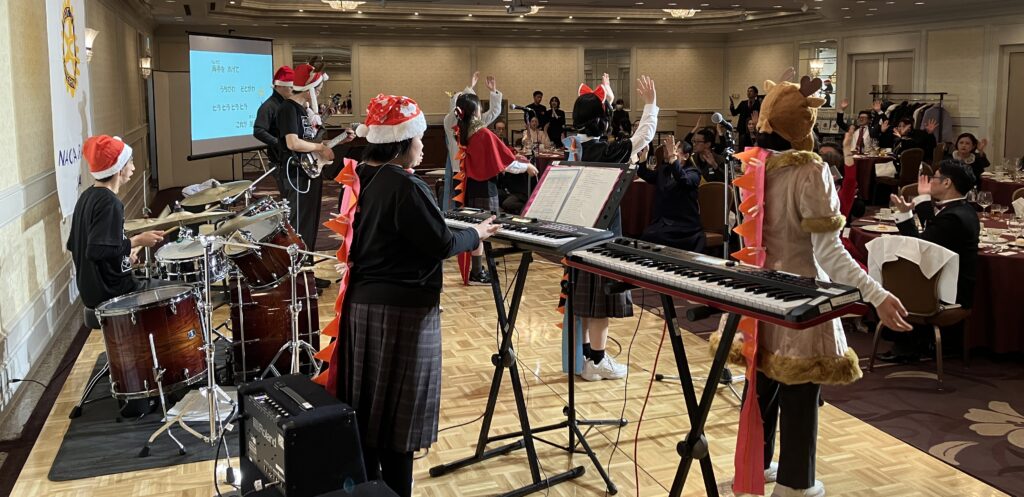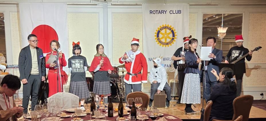 異なる文化や環境の中での経験は、彼にとっても貴重な機会であり、改めて感謝申し上げます。本日のクリスマス例会の開催にあたりましては、会場をご提供いただいた名古屋東急ホテルの皆さまに、多大なご尽力をいただきました。この場をお借りして、心より御礼申し上げます。まず、愛知県立名古屋聾学校の生徒の皆さんには、例年どおり演奏をお願いしております。また、本日お楽しみいただく管弦楽は、ローターアクトともご縁のある名古屋芸術大学の皆さまにご出演いただいております。